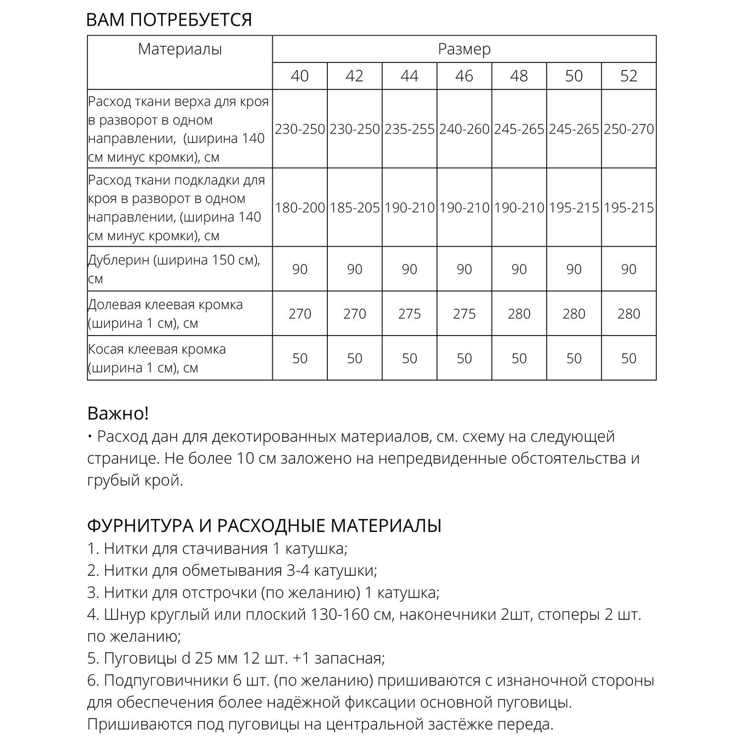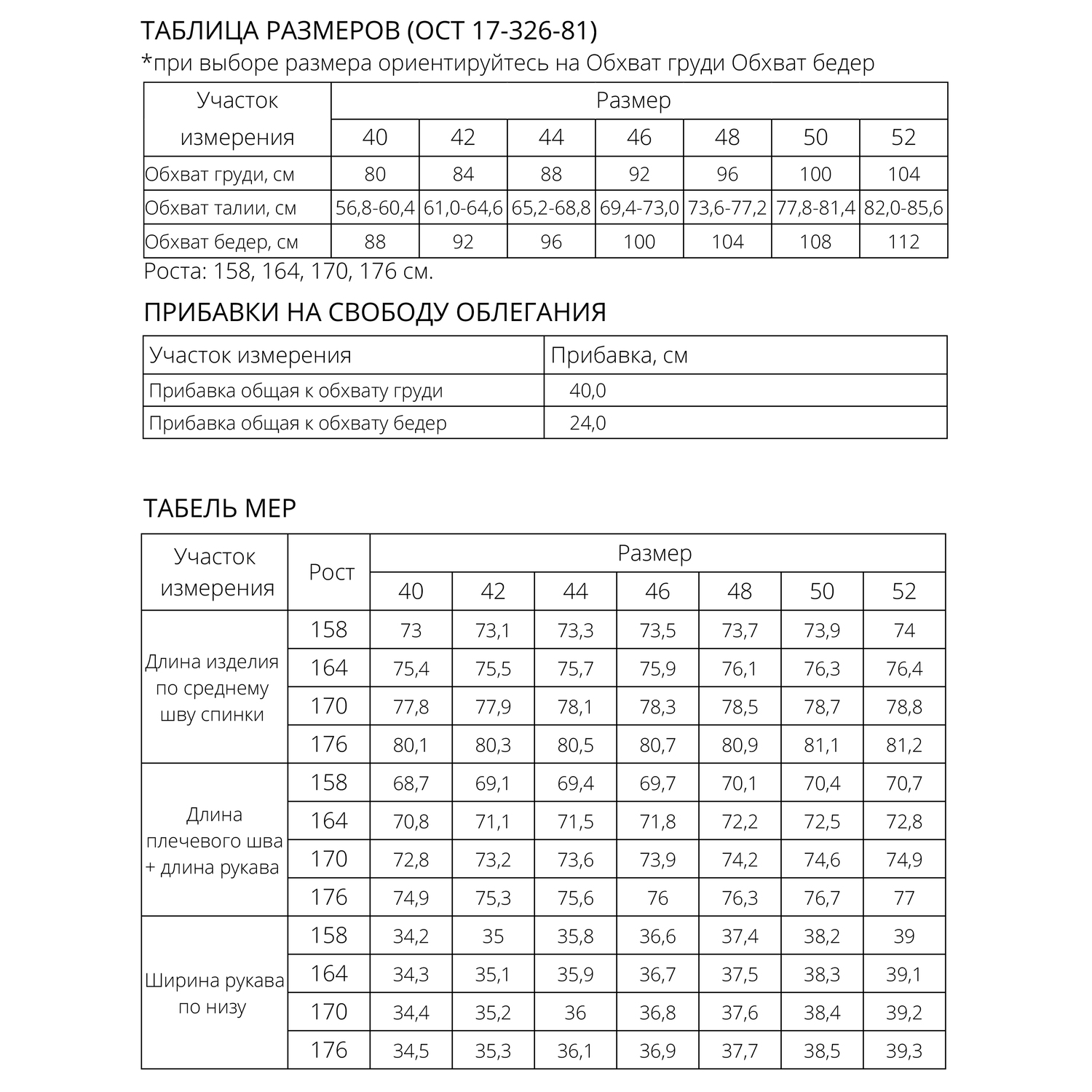 Куртка прямого силуэта, большого объема, длиной ниже линии бедер, с центральной застежкой на 6 петель и пуговиц. Перед с накладными карманами с клапаном. Клапан с застежкой на петлю и пуговицу. Мешковина со встречной складкой. Спинка с притачной кокеткой, нижняя часть спинки со средним швом. На талии настроченная кулиска. Рукав цельнокроеный, со стороны спинки две складки в зоне локтя. По низу рукава расположена пата с застежкой на петлю и пуговицу. Низ криволинейный, обработан обтачкой. Воротник стояче-отложной.